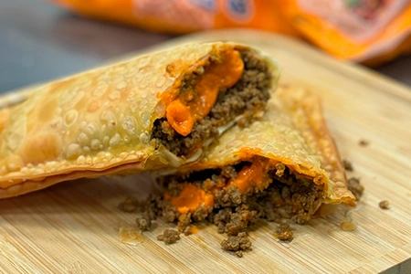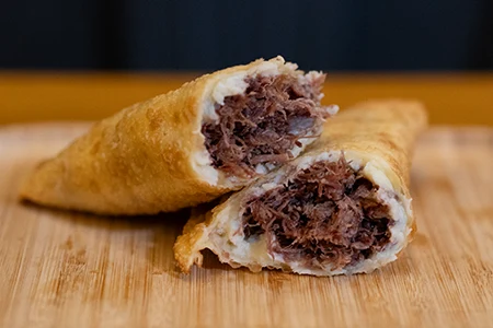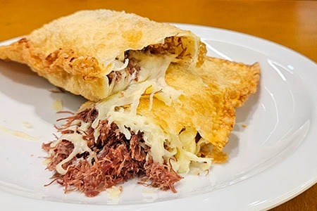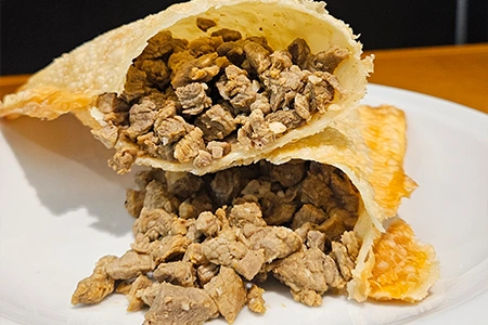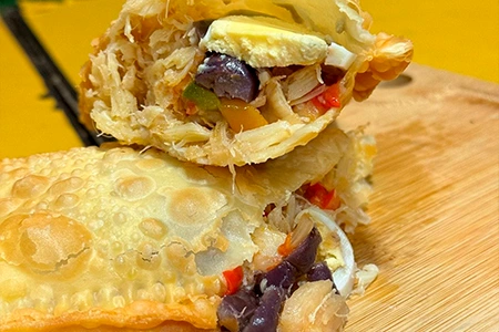 Carne moída, ovo cozido picado, muçarela, catupiry, bacon e azeitona.